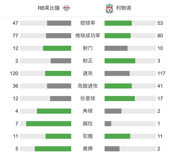 全场比赛结束,莱比锡0-2不敌利物浦。