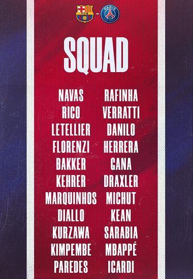 大巴黎是在昨天公布的大名单,这次大巴黎的名单是由姆巴佩和伊卡尔迪领衔的,队内的两大南美巨星内马尔和迪玛利亚缺阵,同时无缘比赛的还有彭贝尔、西蒙斯和贝尔纳特。