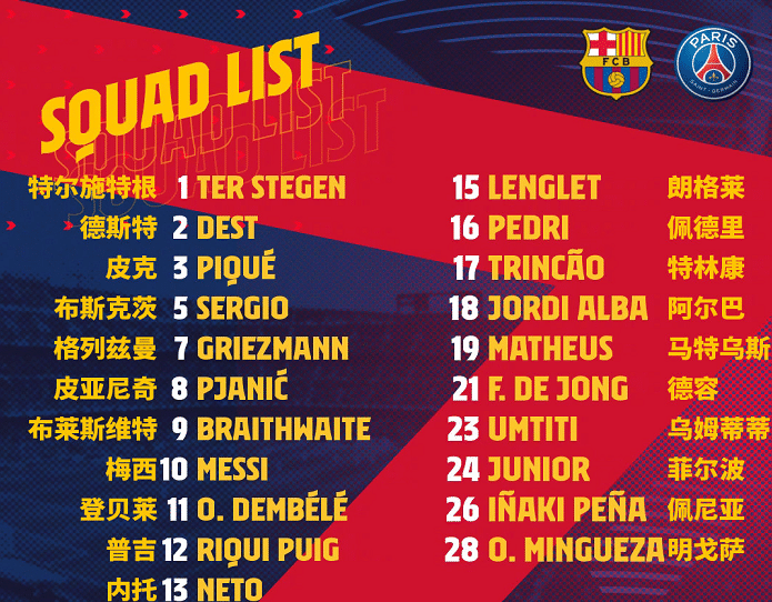 巴萨VS大巴黎名单出炉!梅西和姆巴佩领衔,内马尔迪马利亚缺席