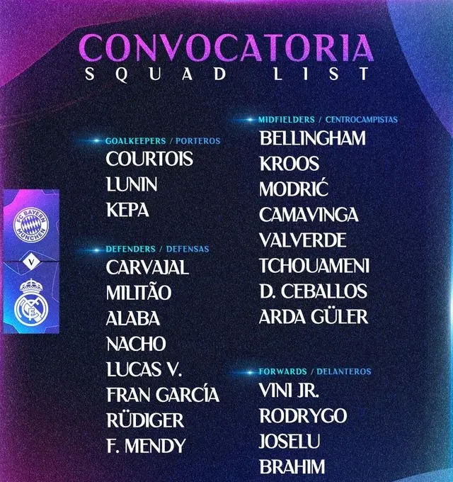360直播吧讯 北京时间4月28日,皇马公布欧冠客战拜仁大名单,贝林厄姆领衔 巴尔韦德、维尼修斯在列。