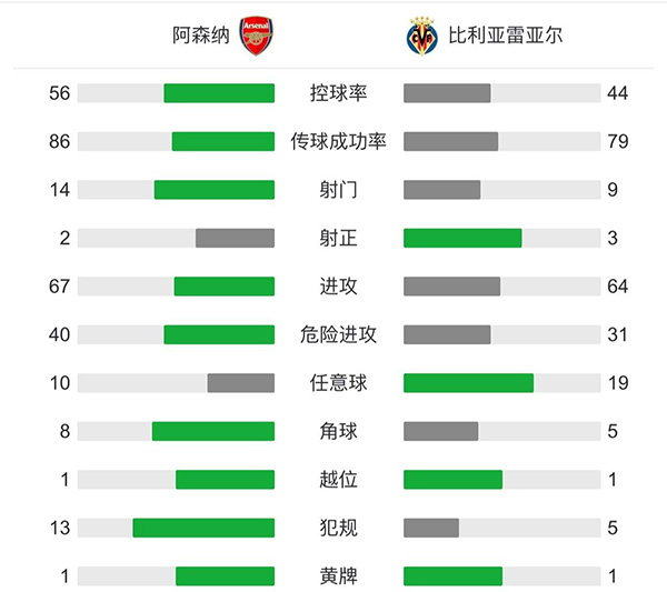 全场比赛结束,阿森纳0-0比利亚雷亚尔。