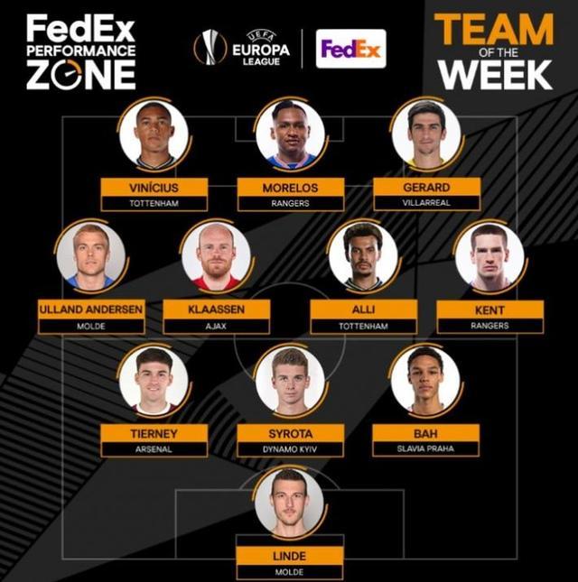 中场:安德森(莫尔德)、克拉森(阿贾克斯)、阿里(热刺)、肯特(格拉斯哥流浪者)