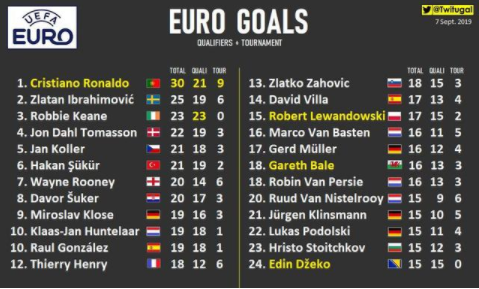 欧洲杯历史射手榜:C罗、伊布、鲁尼、亨特拉尔入围