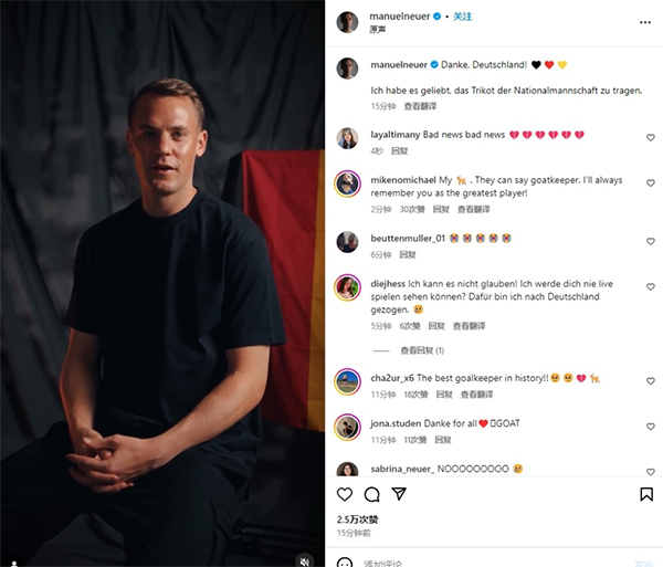 来源:360直播吧08-22 12:42360直播吧讯 北京时间8月21日晚,38岁的德国传奇门神诺伊尔,正式宣布退出国家队,结束长达15年的国门生涯。诺伊尔通过一段视频动态宣布了这则消息,他表示:感谢德国队,我喜欢穿着国家队球衣的感觉。诺伊尔没有发表从国家队退役的感言,只是简单地感谢了德国足协和德国人的支持。