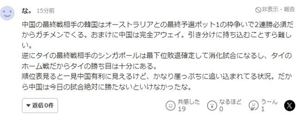 日本球迷更是嘲讽国足,称可以提前祝贺泰国队晋级。