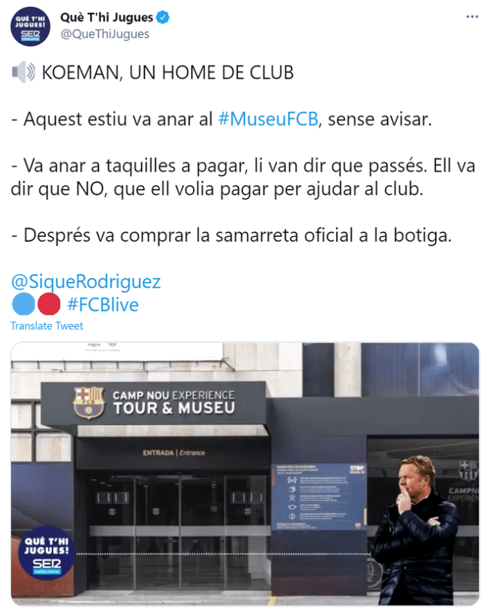 不仅如此,科曼离开时还在博物馆商店里买了一件T恤,塞尔电台也表示科曼是一位真正热爱巴萨俱乐部的人。