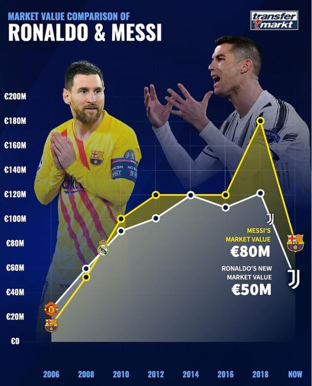 但自那以后,两人的身价就处于下跌趋势,目前33岁的梅西身价8000万欧元,36岁的C罗身价5000万欧元。