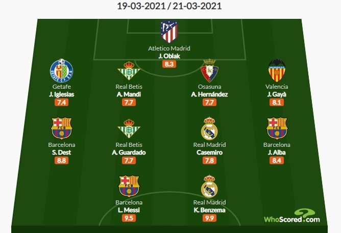 Whoscored西甲28轮最佳阵:梅西领衔巴萨三将 本泽马在列
