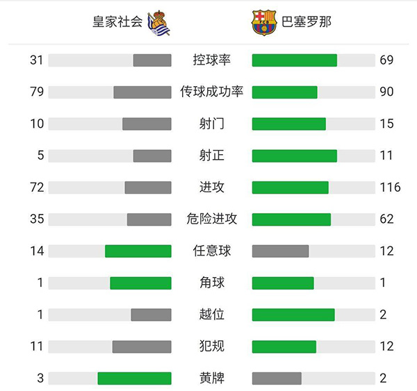 下半场补时4分钟,最终全场比赛结束,巴萨6-1大胜皇家社会。