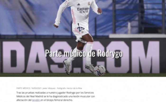 360直播吧3月17日讯 ,皇马官网发布消息:经医疗团队诊断,罗德里戈右股二头肌肌腱肌肉受伤。随后官方又删除了这条消息。