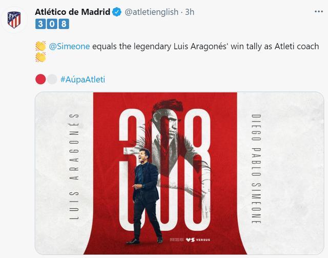 西蒙尼马竞胜场追平传奇教头,并列队史胜场第一