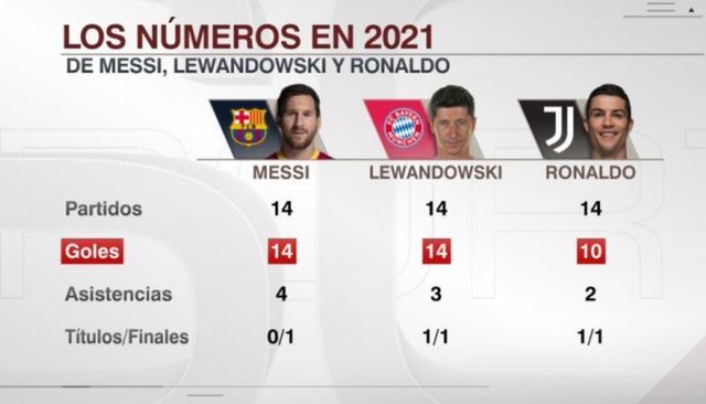 赛后,媒体列出了这三名球员今年的数据,其中梅西14战14球4助,参加了1场决赛,没有赢得冠军。莱万14战14球3助,参加1场决赛赢得1座冠军。而C罗则14战10球2助,参加1场决赛赢得1座冠军。