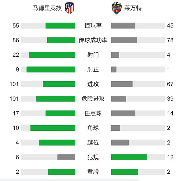 第95分钟,德弗鲁托斯利用奥布拉克冲入前场争抢头球的机会,半场远射破门,莱万特2-0马竞。