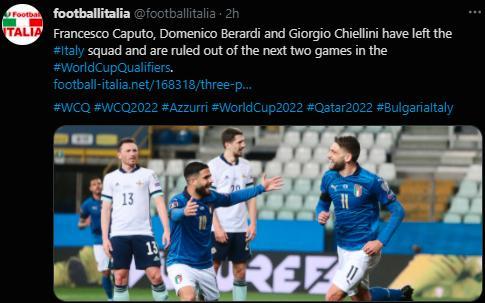 360直播吧讯据意媒报道,基耶利尼、贝拉尔迪、卡普托这三名球员因伤离开了国家队,返回各自俱乐部,他们都不会参加接下来意大利在客场对阵保加利亚和立陶宛的比赛。