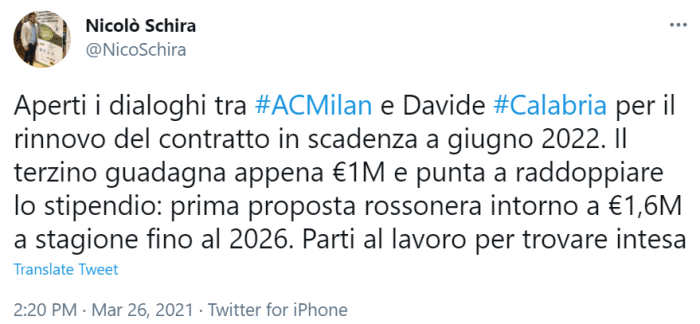 记者: 米兰为卡拉布里亚开新合同, 年薪160万欧