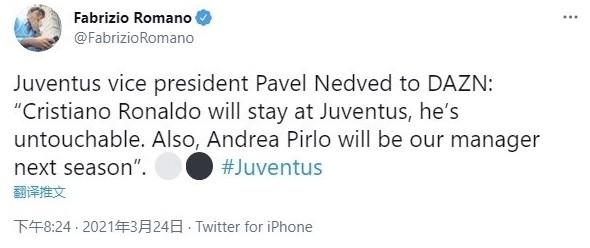 来源:360直播吧03-25 20:10360直播吧3月25日讯 ,知名记者罗马诺在个人社交账号上发文透露,尤文副主席帕维尔-内德维德,已经在接受DAZN的采访时声称,下赛季C罗将会继续留在尤文效力。而备受争议的尤文主帅皮尔洛,也将会带队征战下赛季。内德维德更是用了100%,来形容皮尔洛继续执教尤文的可能。