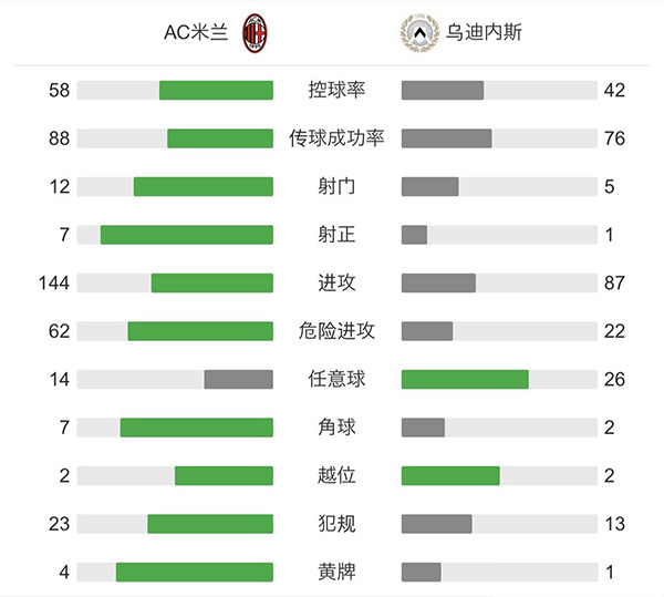 最终全场比赛结束,最终AC米兰1-1乌迪内斯。