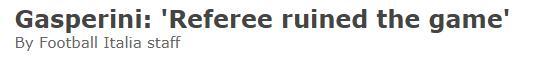 360直播吧2月25日讯 北京时间2月25日,亚特兰大在欧冠1/8决赛首回合少打一人的情况下主场0-1不敌皇马。赛后,亚特兰大主帅加斯佩里尼抨击了当值主裁。
