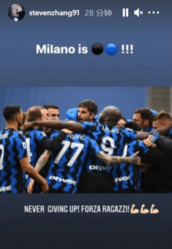 赛后,张康阳在Instagram上写道:“米兰城是蓝黑色的!”