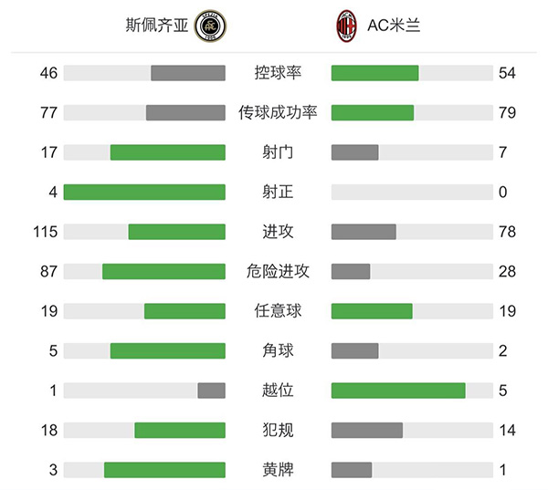 全场比赛结束,AC米兰客场0-2不敌斯佩齐亚。