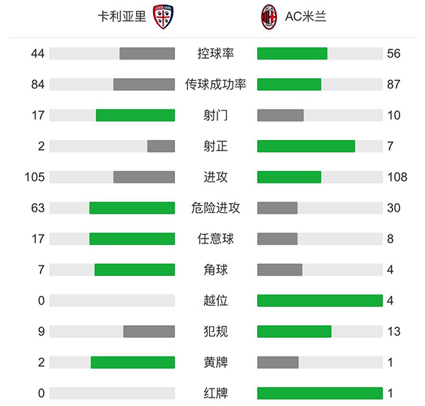 最终,米兰客场2-0击败卡利亚里,送给对手11轮不胜的同时以3分优势继续领跑积分榜。