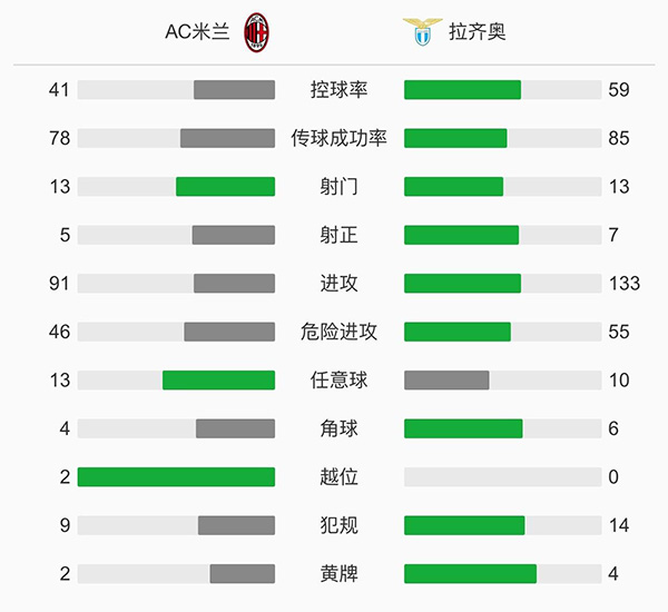第9分钟,米兰取得领先,恰尔汗奥卢开出角球,雷比奇头球攻门将球顶进,打入本赛季个人的首个进球,AC米兰1-0拉齐奥。