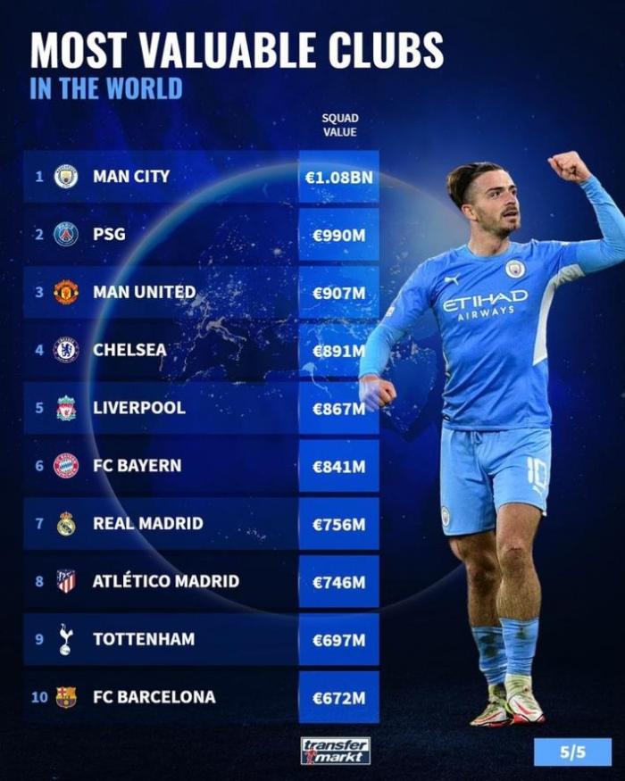 360直播吧10月26日讯 今日,德转更新了世界足坛各俱乐部身价,曼城以10.8亿欧总身价继续占据榜首。曼联排名第三。