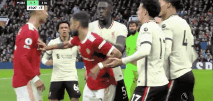 C罗的这个动作不仅被裁判吹罚了犯规,随后多名利物浦包围了C罗,大有围攻C罗讨一个说法的意思,在争议画面之后,很尴尬的一幕出现了,按道理来说,作为球队老大被围攻,曼联的球员一定会火速支援,可是曼联这边只有B费一个人冲上来护住C罗,不过一个B费显得势单力薄,他被利物浦球员推开,又有多名球员包围了C罗,所幸的是裁判急促的哨声保护了C罗,此时曼联的其他球员才摇摇晃晃的出现。