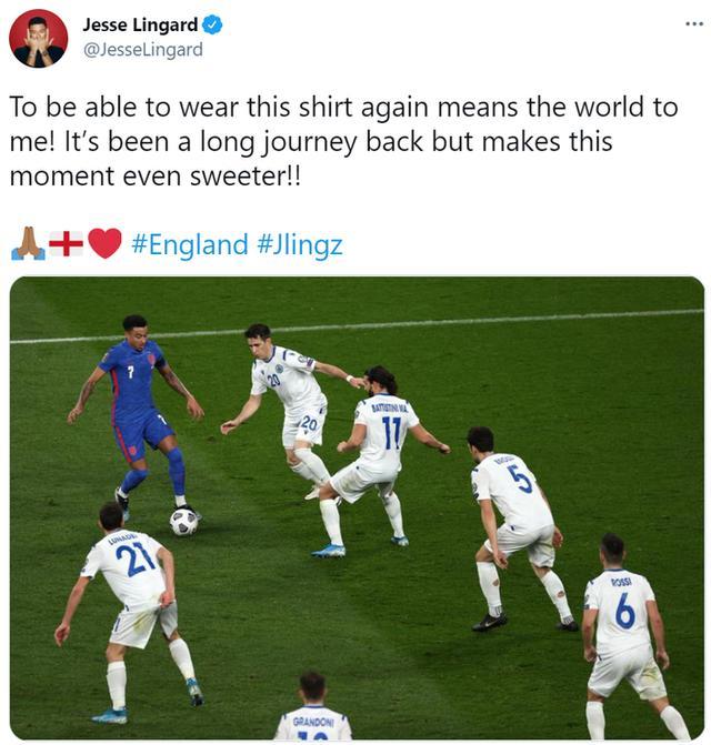 本场比赛,林加德首发并送出一个助攻,帮助勒温完成梅开二度。赛后这位曼联租将晒出自己在比赛期间面对6人防守的照片并写道:“能够再次穿上英格兰球衣对我来说意义重大!这是一段漫长的回归之旅,但这个结果让此刻更加甜蜜!”