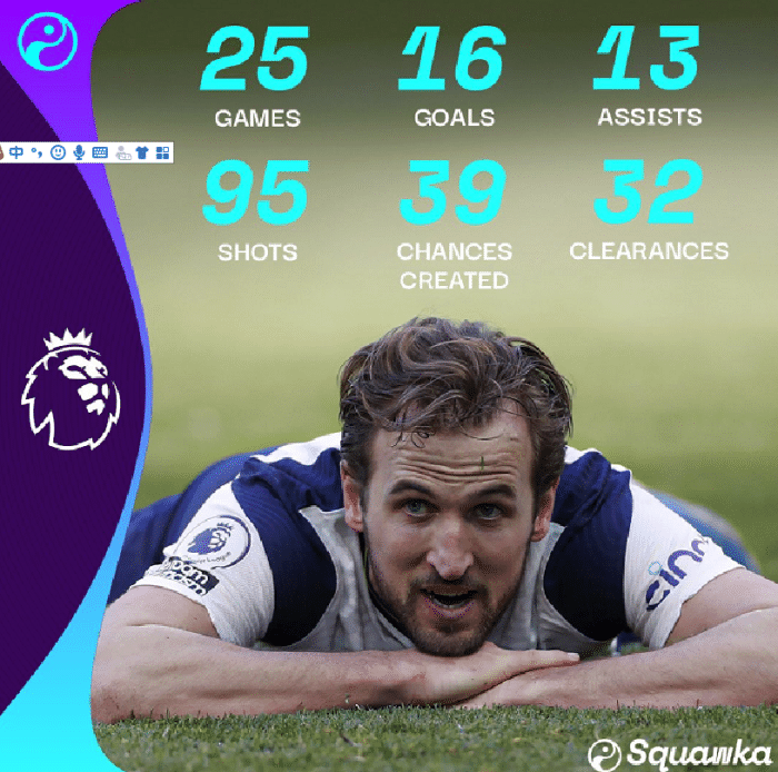 如图,英超官方统计,本赛季凯恩在英超赛场上出场25次,打进16球助攻13次。同时凯恩有95次射门,制造了39次绝佳机会,而且还有32次解围。而他的射门次数、创造机会次数和解围次数都超过了30次,是本赛季唯一一位做到这一点的英超球员。而从这三项主要数据也可以看出凯恩有多么的出色,因为这三项数据对球员的要求太高了。
