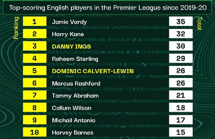 上赛季以来,英格兰球员在英超进球排行榜:凯恩仅第二!