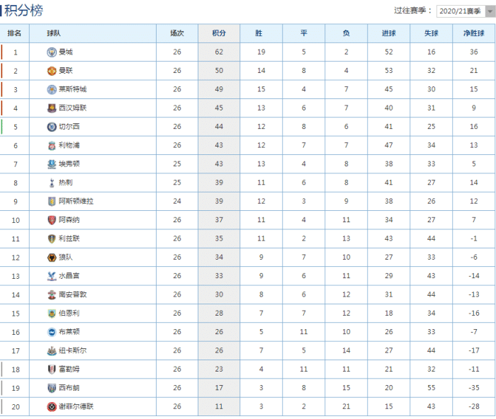 来源:360直播吧03-02 16:07360直播吧3月2日讯 2020-21赛季英格兰超级联赛第26轮的比赛结束了,本轮比赛,曼联和切尔西打平了,而曼城则取得了各项赛事的20联赛,而曼城领先第二名曼联的优势也扩大到了12分,可以说他们夺冠在望了。而利物浦和热刺在连败之后,也相继赢球了,他们似乎也开始为争四发力了。而后面的英超比赛,可能会更加精彩了,而英超争四大戏,正式上演。