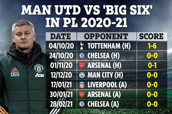 面对所谓英超六强,即曼城、利物浦、切尔西、热刺和阿森纳,曼联本赛季7场比赛只攻入一球,就是赛季初1-6惨败给热刺时布鲁诺·费尔南德斯的点球。而之后6场,曼联连续哑火,而且其中5场都以0-0告终。