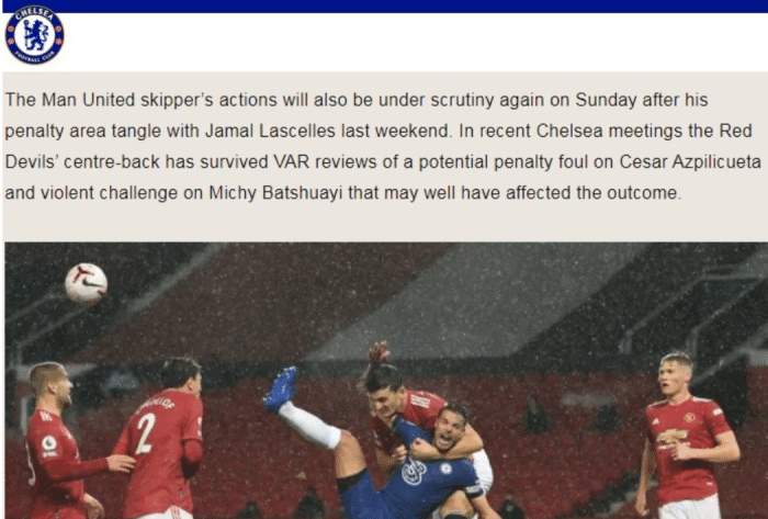 在本场比赛前,切尔西官网发布了比赛前瞻,并提到本赛季两队第一次交锋时马奎尔放倒阿斯皮利奎塔裁判没有判点的事情。索帅对此感到很愤怒,他说道:“切尔西无耻地在赛前把他们谈论马奎尔的内容放到他们的官网上,这些盘外招实际上是在影响裁判,你可以看看他们是怎么写的,他们明显是在向裁判施压。”