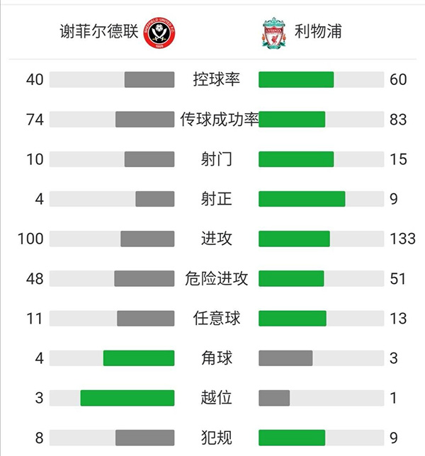 全场比赛结束,利物浦客场2-0战胜谢菲尔德联。