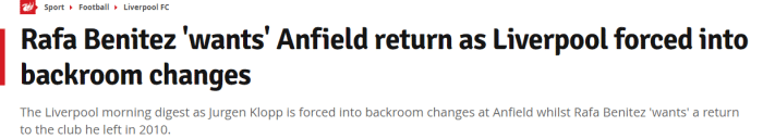 “也有可能是急需一个人稳住局面的时候,但肯定不是现在。按利物浦老板约翰-亨利的行事方式,以及克洛普所做的一切,贝尼特斯几乎不可能现在回归。”