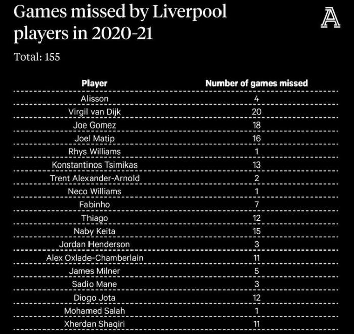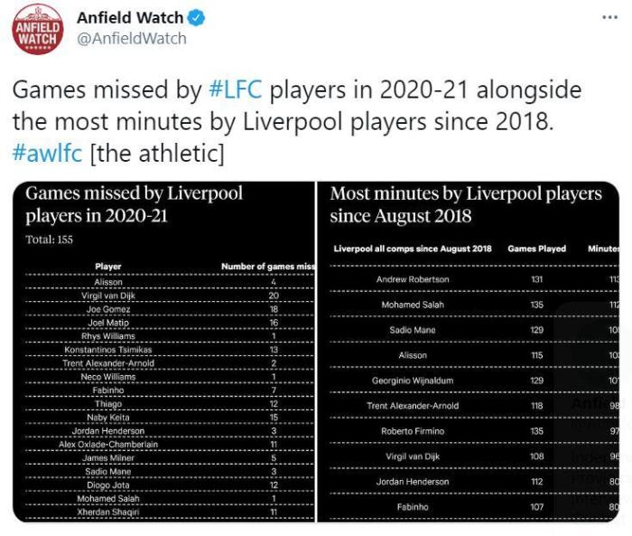 在这155场中,重伤的范迪克是缺阵比赛的最多的,达到20场。另外两名中后卫,乔-戈麦斯和马蒂普分别缺阵18场和16场。