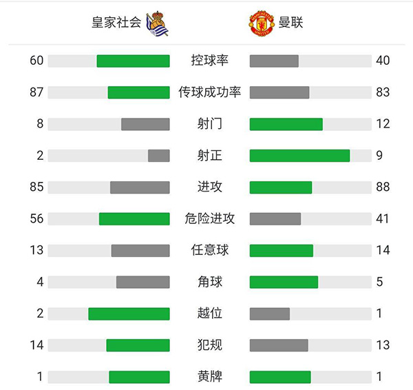 第26分钟,曼联取得领先,拉什福德左路送出挑传,雷米洛出击和队友撞到一起,B费拿球推射空门得手,皇家社会0-1曼联。