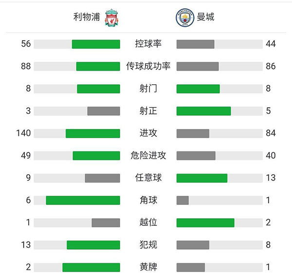 全场比赛结束,曼城客场4-1战胜利物浦。
