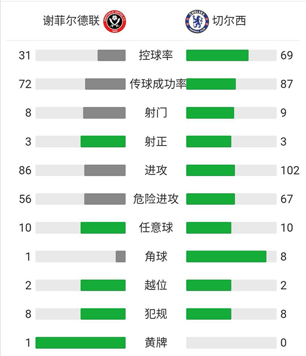 全场比赛结束,切尔西2-1击败谢菲尔德联。