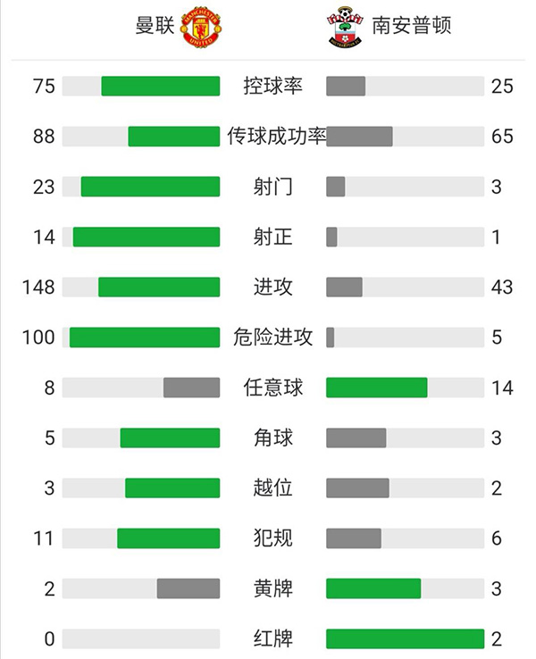 全场比赛结束,曼联9-0大胜南安普顿,多赛两场积分追平曼城。