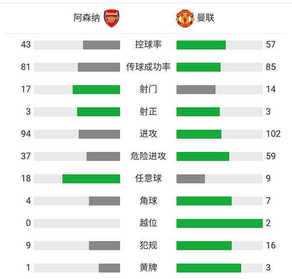全场比赛结束,阿森纳0-0曼联。