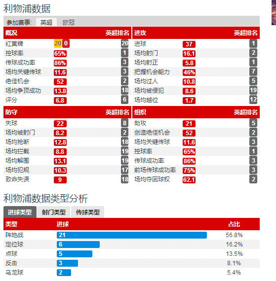 而范迪克等人的受伤,对球队的进攻也有很多的影响。组织方面的数据不多说了,就说定位球。为什么单说定位球?利物浦最怕的就是攻坚战,不过范迪克加盟之后,利物浦不再惧怕攻坚战了,为什么?在阵地战中,利物浦拥有范迪克这个头球好手,范迪克可以自己进球,也可以给队友摆渡,可以帮助队友吸引防守。而本赛季,利物浦在定位球方面只打进了6球,其中3球还是范迪克和马蒂普打进的。但是,现在这两人都无法出场,球队在定位球方面就很难获得进球了。
