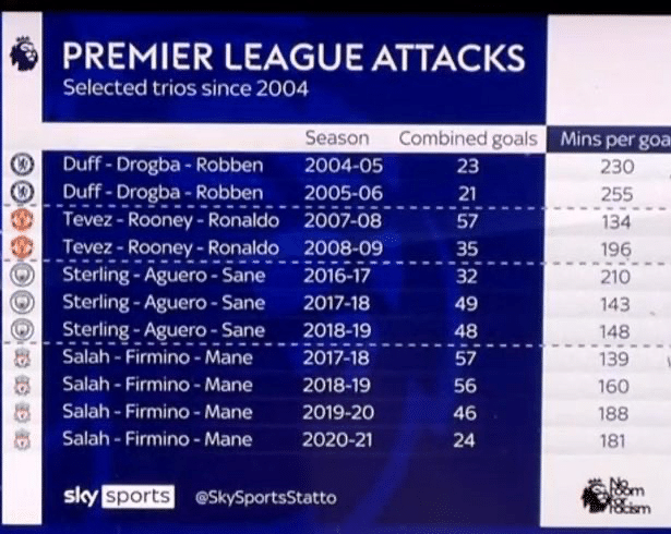 17-18赛季,利物浦的马内、萨拉赫和菲尔米诺的组合笑傲英超,那个赛季三人合力打进了57球,不过效率稍低一些,他们要没139分钟才能打进一球。而排名第三的是17-18赛季曼城的斯特林、萨内和阿奎罗的组合,这个组合一共打进了49球,平均143分钟打进一球,当然,需要说一下的是,如果不是斯特林在踢快乐足球,如果不是阿奎罗老受伤,这个组合进球会更多,效率会更高。