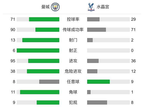 全场比赛结束,曼城主场4-0大胜水晶宫。