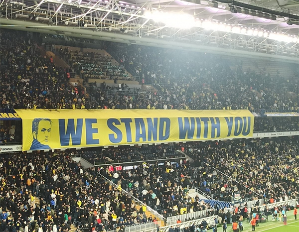 不过在费内巴切主场对阵安塔利亚体育的比赛中,主场球迷还是冒着被处罚的风险,在主场看台上打出的巨型横幅,横幅上写着 “WE STAND WITH YOU”(我们支持你),横幅左侧还印有穆里尼奥的头像,来表达对62岁的葡萄牙传奇名帅的声援。这一幕,可谓让人看得十分动容。