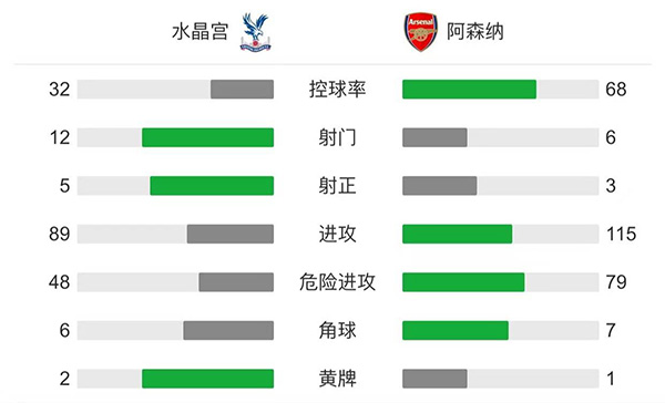 第90分钟,阿森纳前场右侧肋部起球传中,马丁内利后点插上胸部停球抹过门将跟着将球打进空门,阿森纳2-1水晶宫。