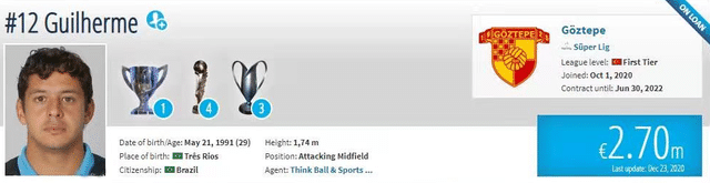 现年29岁的吉列尔在2010年开启职业生涯,先后效力于布拉加、吉尔维森特、华沙莱吉亚、贝内文托、马拉蒂亚体育、特拉布宗体育、哥兹塔比,生涯共计打进了48球助攻20次,传射能力均衡,将成为广州城的进攻核心之一。