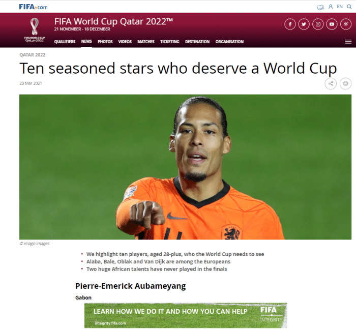 来源:360直播吧03-24 16:15360直播吧3月24日讯2022年世界杯越来越近,而国际足联也不停的为世界杯造势,近日,FIFA就在官网上发布了应该参加,也值得参加世界杯的10名球星,其中范迪克等诸多球星全部在列,而且里面还有一个令人意外的名字,那就是武磊,FIFA认为他也值得参加世界杯的比赛,而且FIFA官网还点评了武磊的表现。好了,话不多说,一起看看FIFA评选的球员有哪些,而他们对武磊的点评又如何吧!
