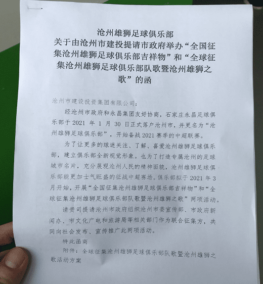 来源:360直播吧03-11 19:49360直播吧3月11日讯 今天,网络上传出沧州雄狮公开征集吉祥物和队歌的消息,相关的征集函也已经被曝光了,其实球队换了所在地之后重新征集吉祥物和队歌是很正常的,但是在沧州雄狮的征集函信息量却很大,其中最显眼就是“沧州雄狮足球俱乐部能够更加士气旺盛的征战中超联赛”。